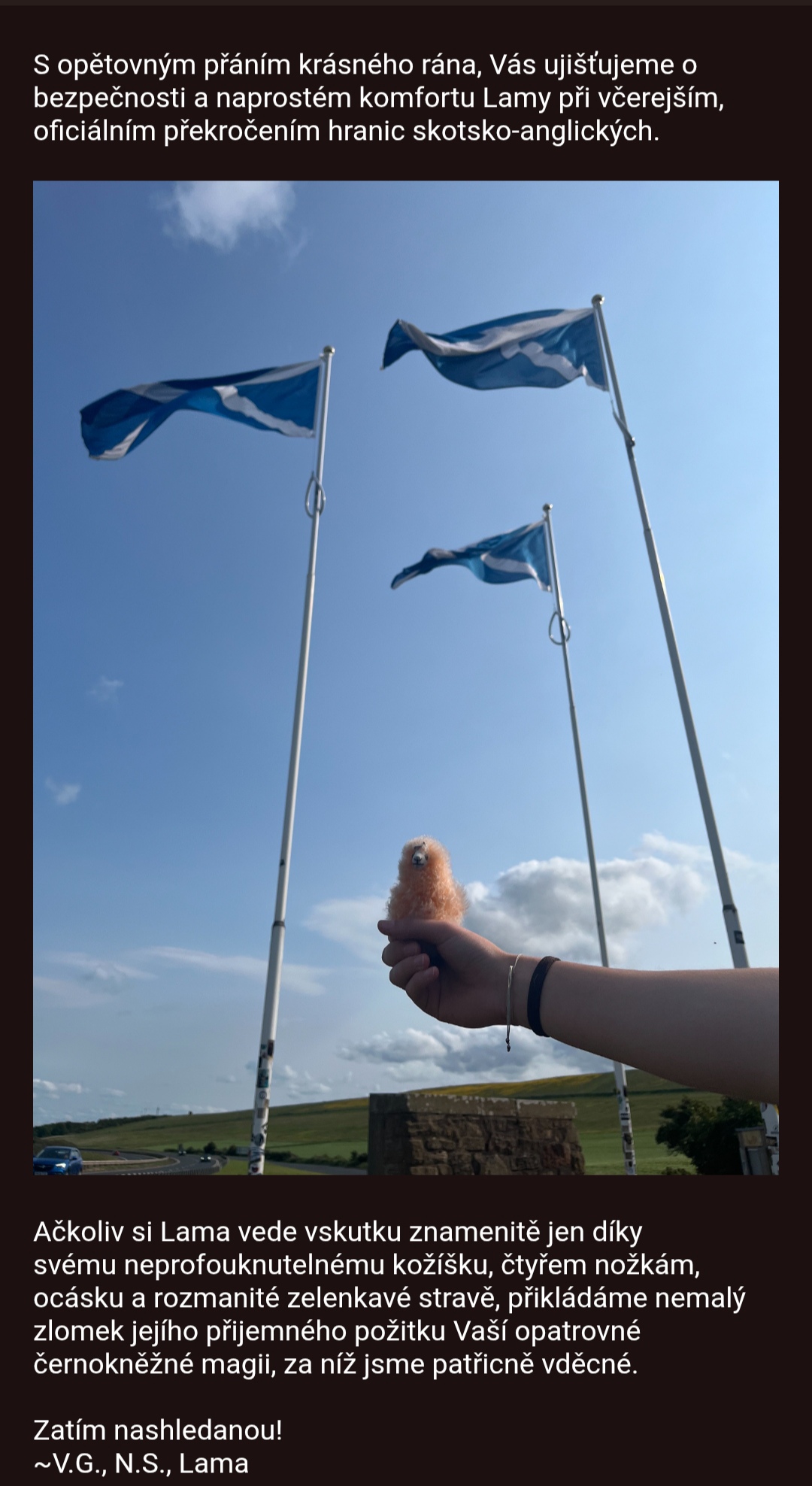 Lama je teď samozřejmě opět v péči svého černokněžníka, stejně tak, jako všichni, kdo se s ní do Skotska podívali - a stejně jako Lama mají na co vzpomínat!