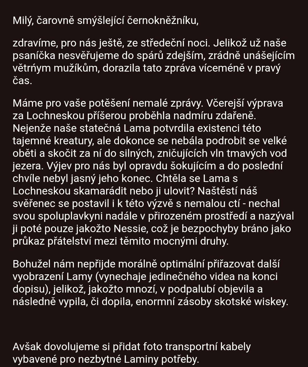 Zvrat je v tom, že Lamu nějaký darebák nedopatřením vzal s sebou na palubu autobusu, a nám tak nezbývalo nic jiného než ji vzít s námi. Nebojte, pana profesora jsme samozřejmě celou cestu ujišťovali psaníčky o jejím zdravotním stavu a dobrodružstvích - proto tedy přidaným prvkem budou vložená právě tato psaníčka.