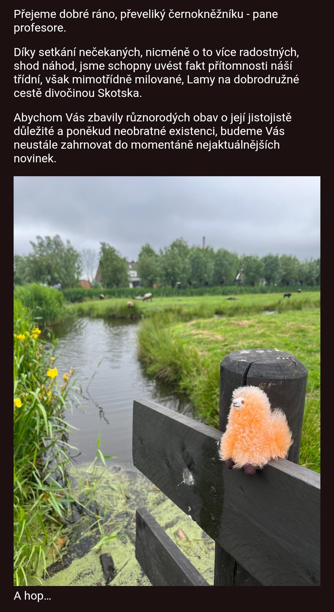 Byla jsem pověřena jistým úkolem - napsat něco málo o výpravě naší třídy 2.B do Skotska a Nizozemí, která proběhla v dnech 29.5-7.6. Jeden z prvků mého prohlášení je jaksi neobvyklý, jedná se o dobrodružství naší třídní Lamy, a proto raději začnu jeho objasněním...